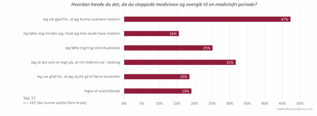 Næsten halvdelen (47 procent) var glade for at kunne undvære medicinen. Det gjaldt i særdeleshed dem, der tidligere havde fået behandling med tabletter (72 procent). Færre nyligt medicinfrie (kortere end seks måneder) var glade for at undvære medicinen (41 procent), flest blandt dem, der havde været medicinfrie i et år eller længere (52 procent. Mange så det også som et tegn på, at helbredet var i bedring (32 procent). Næsten dobbelt så mange kvinder som mænd følte sig trygge ved situationen (30 procent vs. 18 procent).